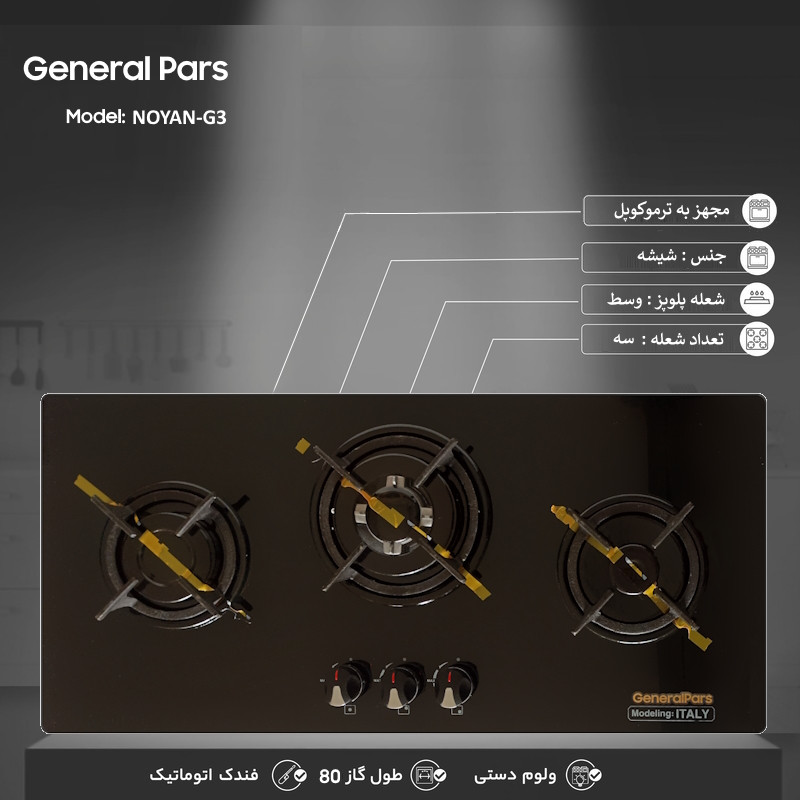 این محصول از سری جدید محصولات جنرال پارس می باشد که با کیفیت بالا و ظرافت تولید شده است اجاق گاز جنرال پارس مدل نویان مجهز به ترموکوپل سریع فندک اتوماتیک و با بدنه شیشه ای سکوریت آنتی شوک نشکن مقاوم تا 600 درجه سانتی گراد تولید شده است .